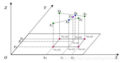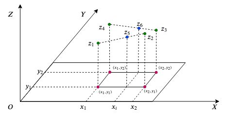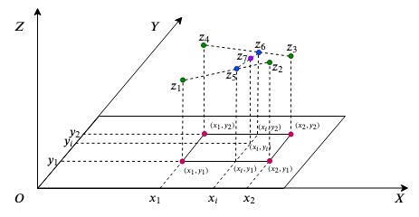 第一步,进行x轴方向的线性插值。当y取值\(y_1\)时,进行点\((x_1,z_1)\)和点\((x_2,z_2)\)之间的插值,得到插值点\((x_i,z5)\);同理y取值\(y_2\)时,进行点\((x_1,z_4)\)和点\((x_2,z_3)\)之间的插值,可得第二个插值点\((x_i,z_6)\)。