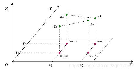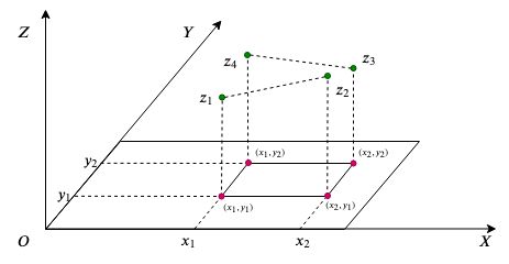 双线性插值算法,是在线性插值的基础上进行多次插值的结果。 如下图所示,假设插值点\({(x_i,y_i)}\)的坐标点\(x_i\)和\(y_i\)范围满足,\(x_1\le x_i \le x_2\),\(y_1\le y_i \le y_2\),其中\((x_1,y_1)\)对应数值为\(z_1\),\((x_2,y_1)\)对应数值为\(z_2\),\((x_2,y_2)\)对应数值为\(z_3\),\((x_1,y_2)\)对应数值为\(z_4\)。